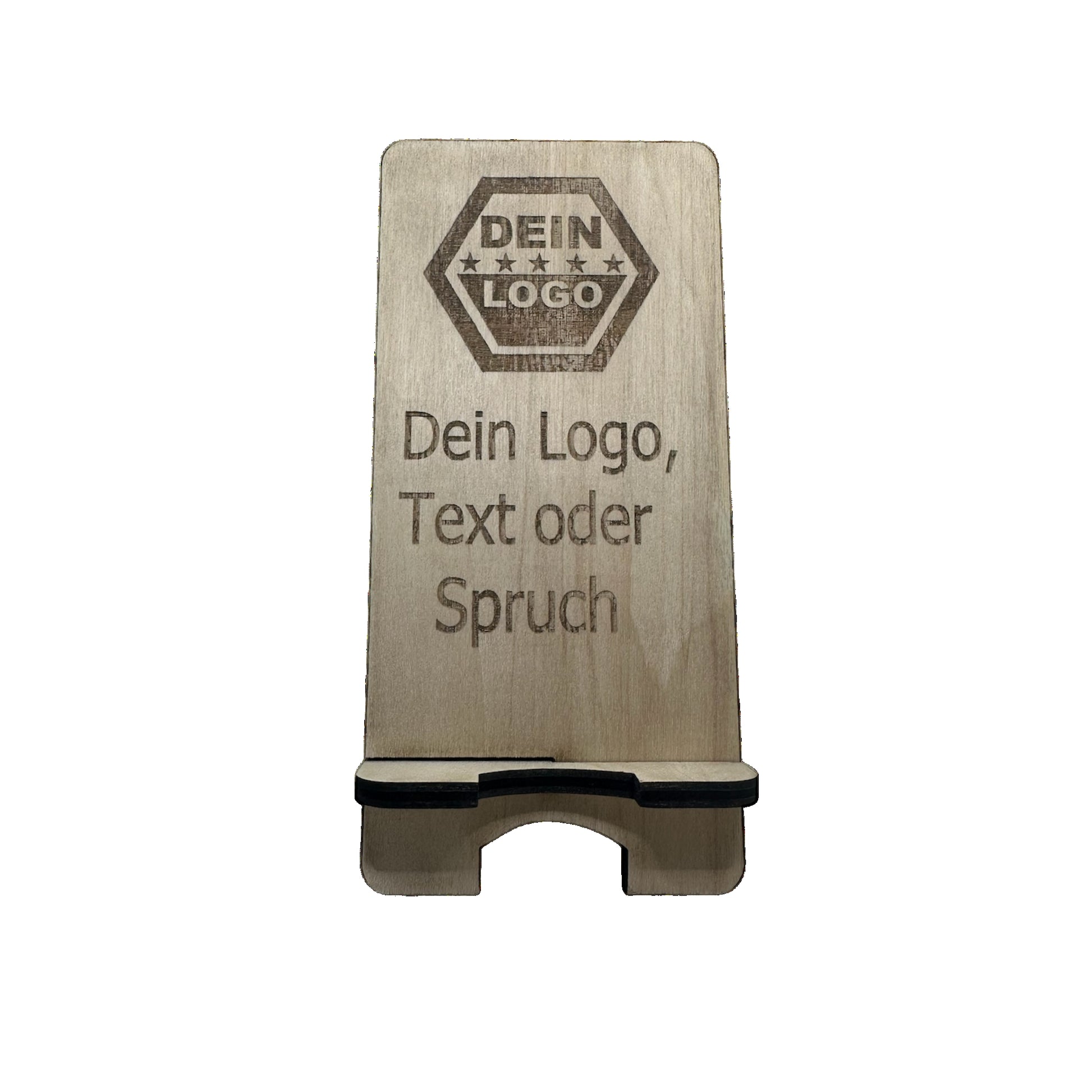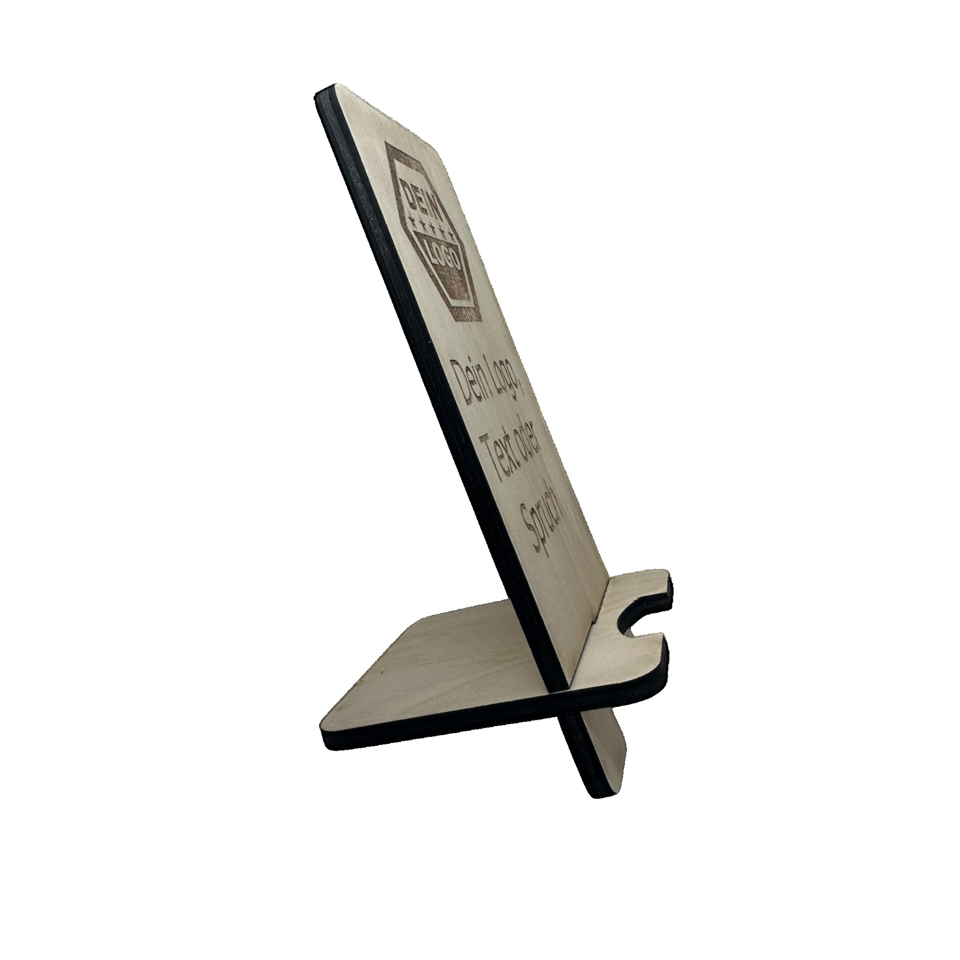 Handyständer aus Holz personalisiert – Handyhalter Fichte mit LOGO Gravur nachhaltig