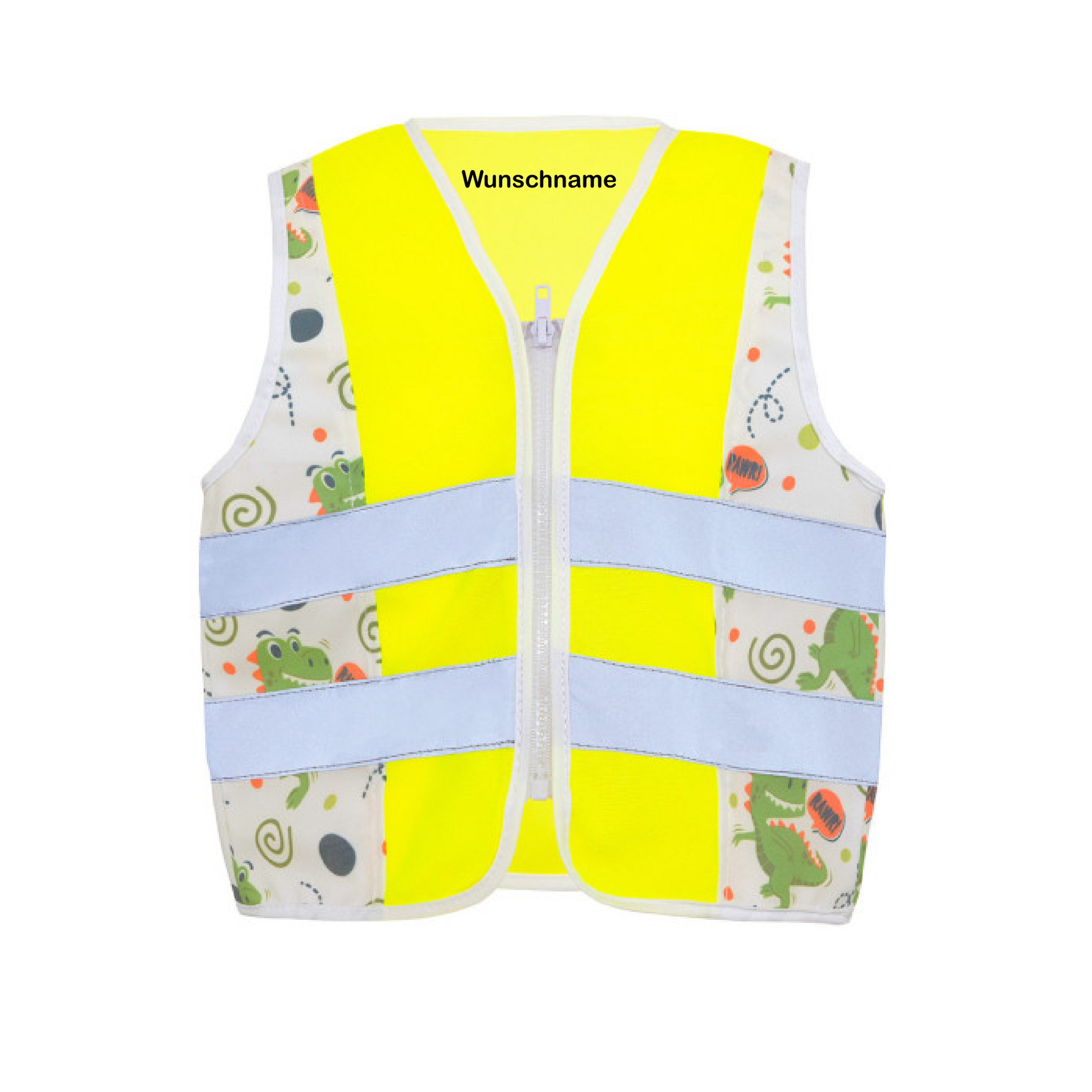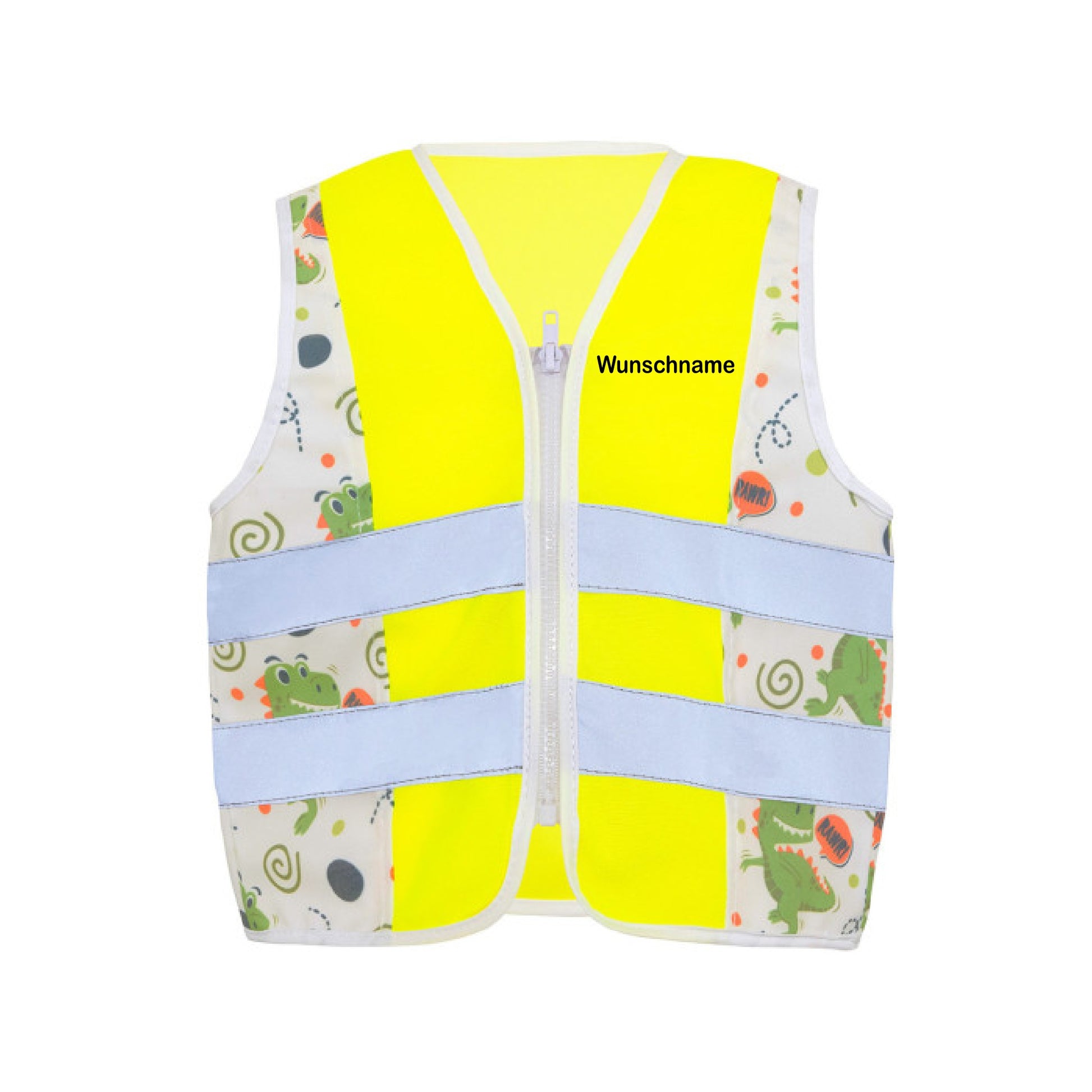 Kinder-Warnweste mit Namen Aufdruck Wunschnamen - Funktionsweste - Dino Gelb